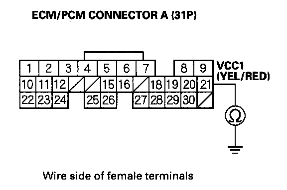 21. Check for continuity between PGM-FI main relay 14P connector terminal No.2 and body ground.