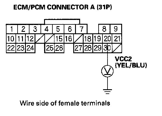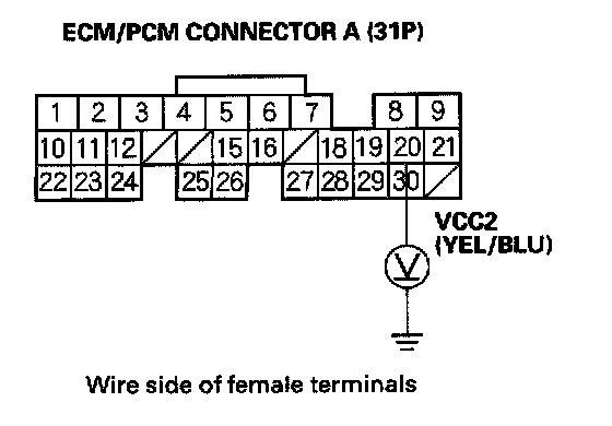 44. Measure voltage between body ground and ECM/PCM connector terminals A2 and A3 individually.