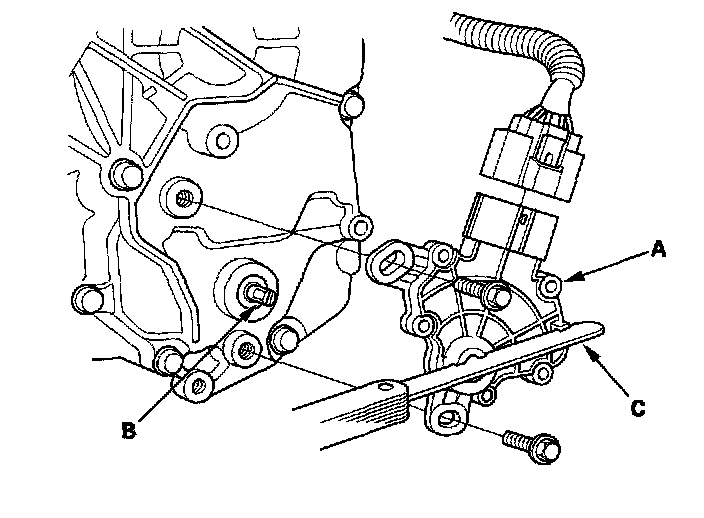 7. Align the cutout (A) on the rotary-frame with the neutral positioning cutouts (B) on the transmission range switch (C), then put a 2.0 mm (0.08 inch) feeler gauge blade (D) in the cutouts to hold it in the N position.