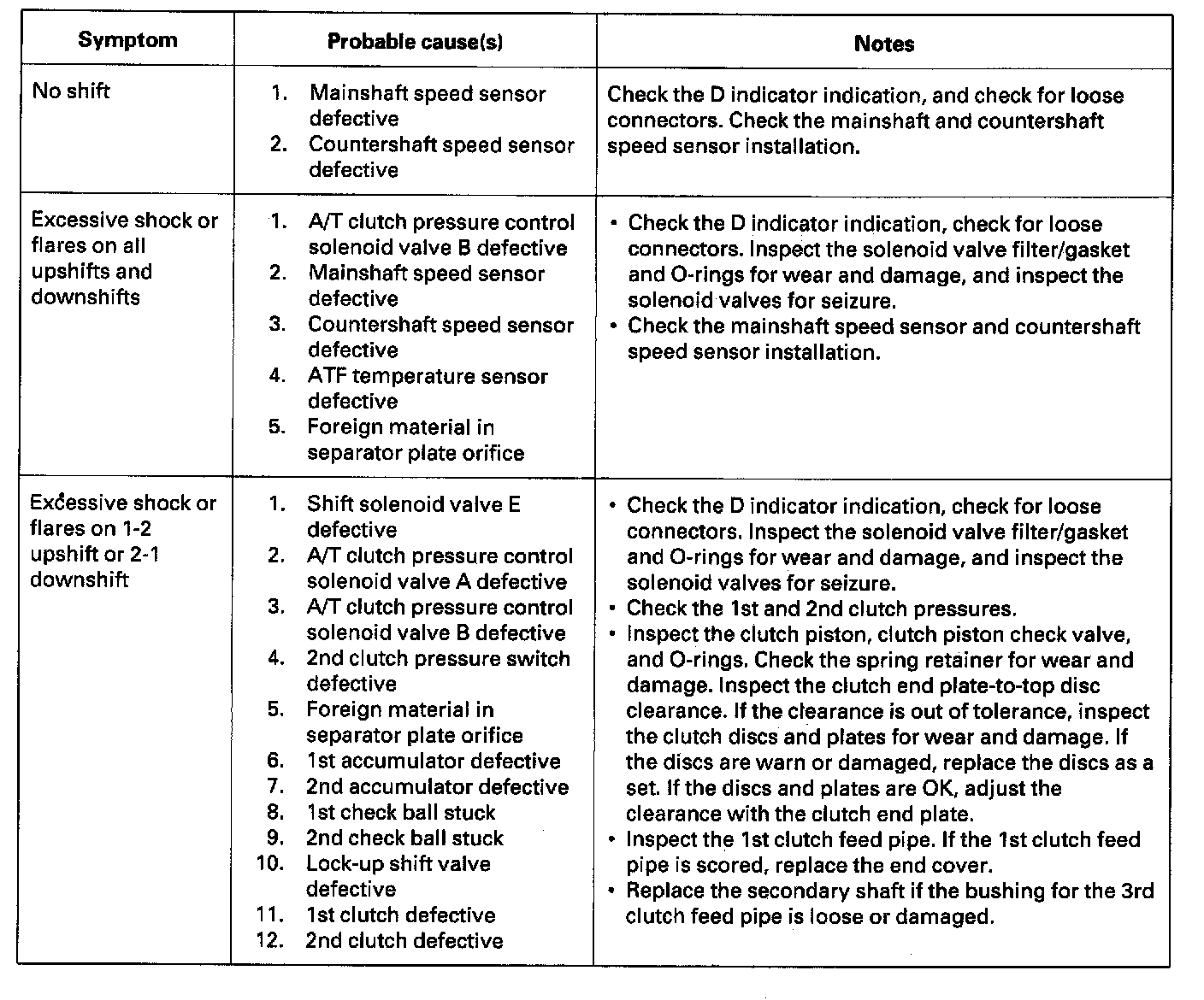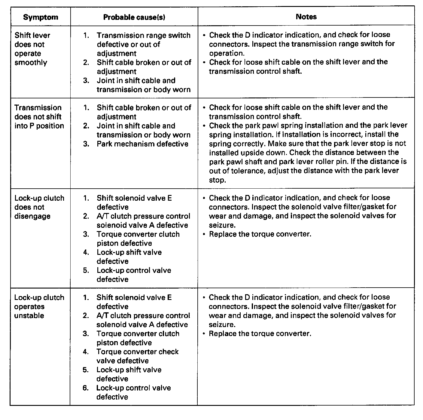 Symptom Troubleshooting IndexThese symptoms DO NOT trigger Diagnostic Trouble Codes (DTCs) or cause the D indicator to blink. If the Malfunction Indicator Lamp (MIL) was reported ON or the D indicator has been blinking, check for DTCs. But if the vehicle has one of the systems in the following chart, check the probable cause (s) for it, in the sequence listed, until you find the problem.