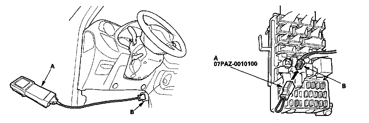 2. Connect the Honda PGM Tester (A) to the DLC (16P) (B), and follow the Tester's prompts in the "SCS" menu (see the Honda PGM Tester Operator's Manual).