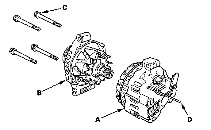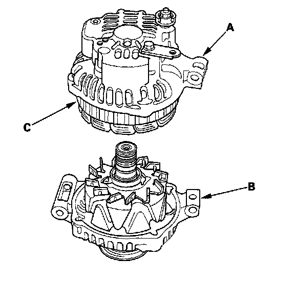 6. Separate the rear housing (A) and drive-end housing (B) with the stator (C) attached to the rear housing.