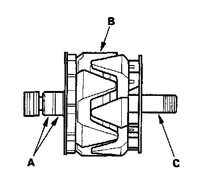 17. Check that there is no continuity between each slip ring (A) and the rotor (B) and the rotor shaft (C).