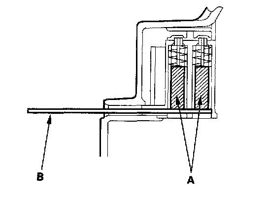 20. Push the brushes (A) in, then insert a pin or drill bit (B) (about 1.8 mm (0.77 in.) diameter) to hold them there.