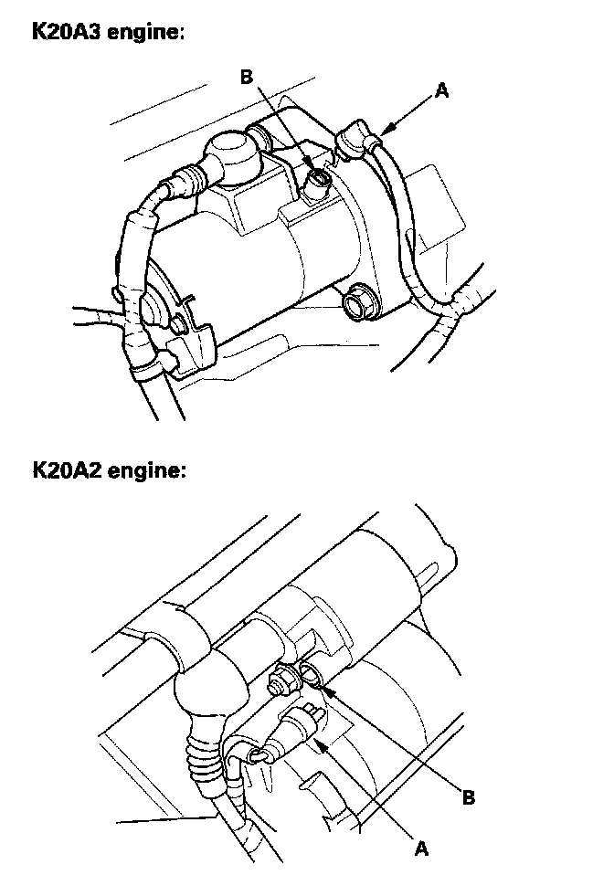 5. Make sure the transmission is in neutral, then disconnect the BLK/WHT wire (A) from the starter solenoid (B). Connect a jumper wire from the battery positive terminal to the solenoid terminal.