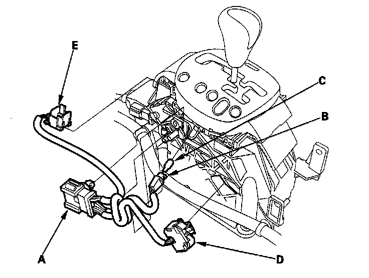 4. Remove the transmission gear selection switch (D) and park pin switch (E) and install the new switches and connector.