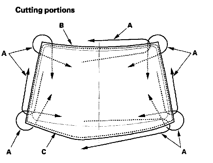 7. With a helper on the outside, pull the piano wire (A) back and forth in a sawing motion. Hold the piano wire as close to the windshield (B) as possible to prevent damage to the body and dashboard. Carefully cut through the rubber dam and adhesive (C) around the entire windshield.