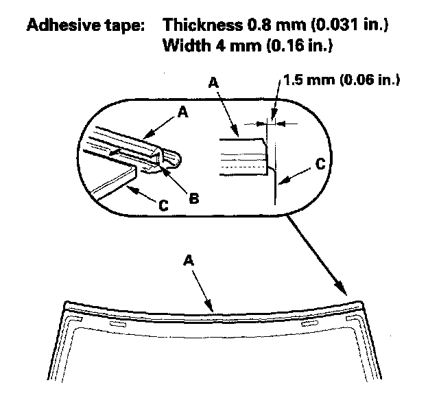 13. Attach the molding (A) with adhesive tape (B) to the corner edge of the windshield (C). Be careful not to touch the windshield where adhesive will be applied.