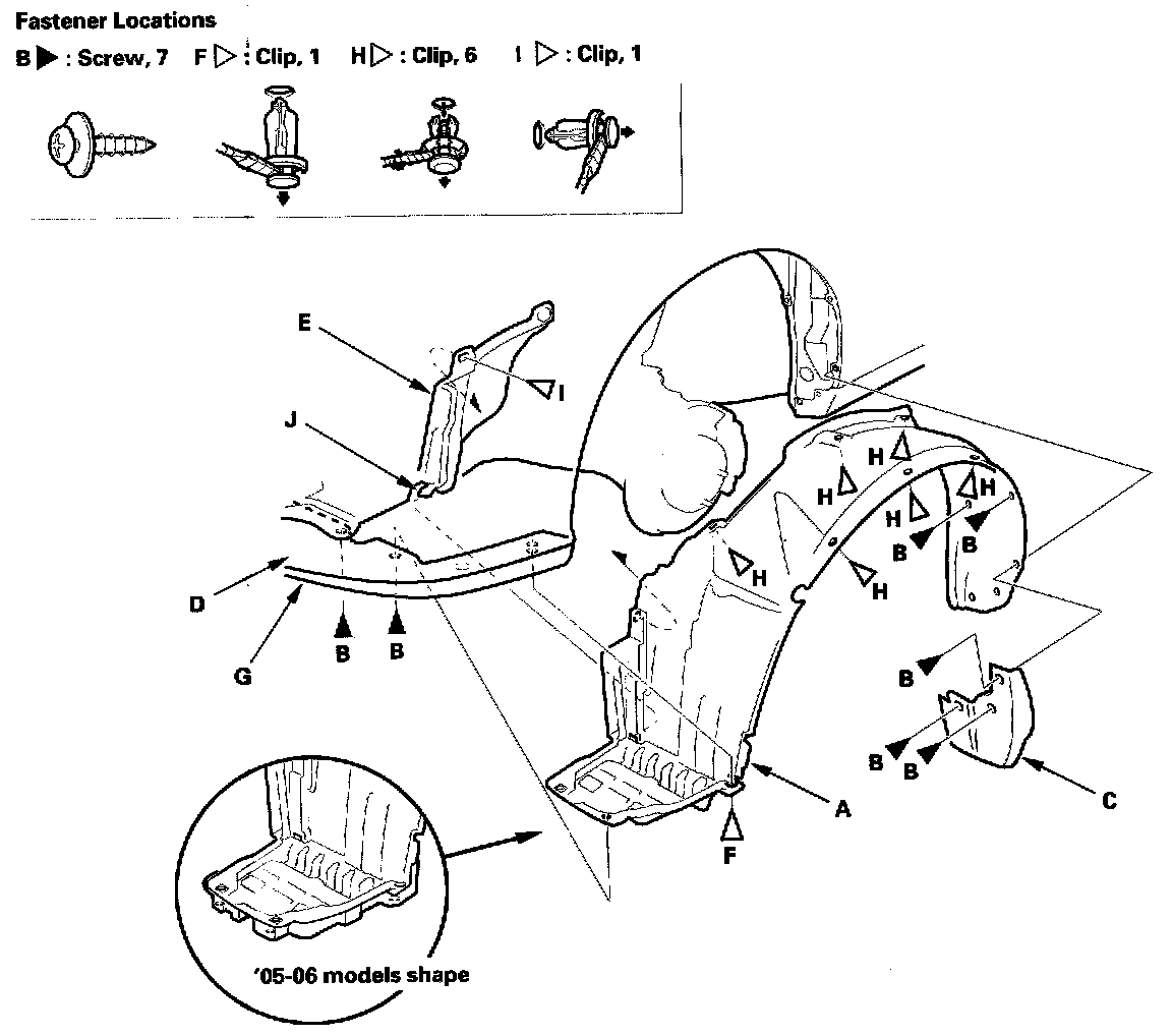3. From the wheel larch, remove the clips (H, I) securing the front inner fender (and splash shield) on the body.