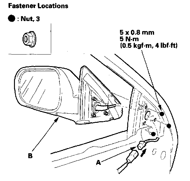 4. Disconnect the connector (A). While holding the mirror (B), remove the nuts, then remove the mirror. Take care not to scratch the door.