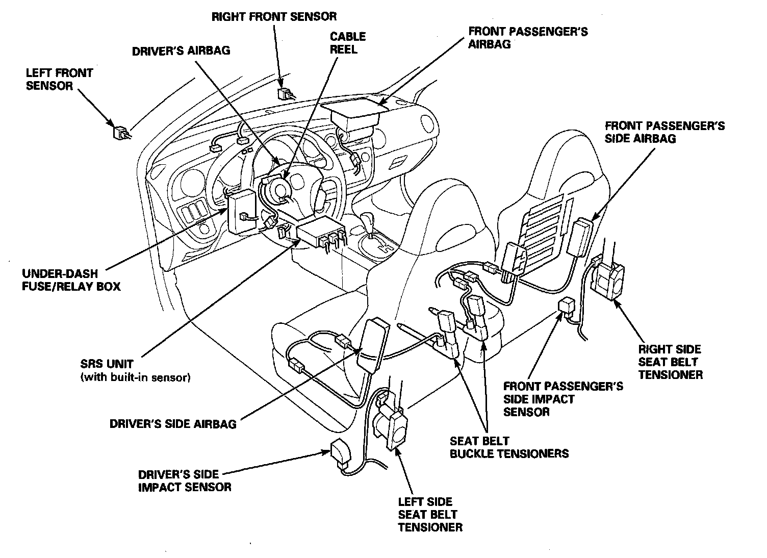 Supplemental Restraint System (SRS)This model has an SRS which includes a driver's airbag in the steering wheel hub, a passenger's airbag in the dashboard above the glove box, seat belt tensioners in the front seat belt retractors, seat belt buckle tensioners in the front seat belt buckles, and side airbags in the front seat-backs. The SRS unit is separate from the airbag assembly and has built-in sensors. The following precautions should be observed when performing sheet metal work, paint work, and repair work around the locations of the SRS components.