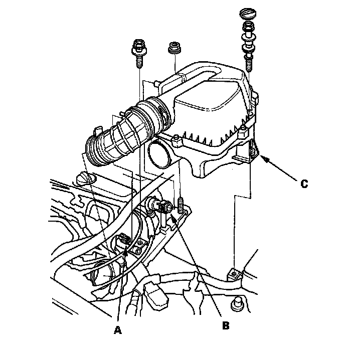 6. Disconnect the Intake Air Temperature (IAT) sensor connector (A), and remove the breather hose (B), then remove the air cleaner housing (C).