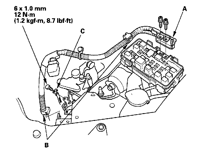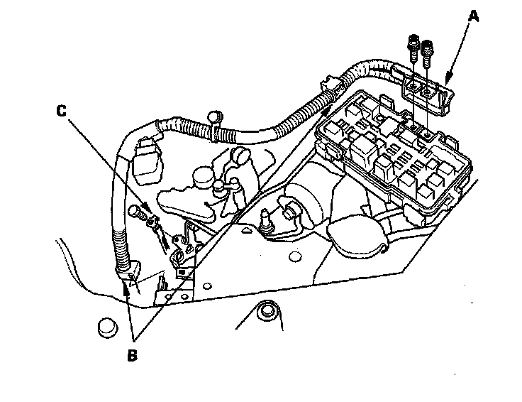 8. Remove the battery cable (A) from the under-hood fuse/relay box, then remove the harness clamps (B) and ground cable (C).