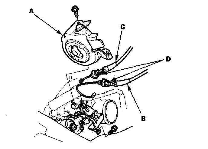 9. Remove the throttle cover (A). Fully open the throttle link and cruise control link by hand, then remove the throttle cable (B) and cruise control cable (C) from the links. Loosen the locknuts (D), and remove the cables from the bracket (K20A3 engine).