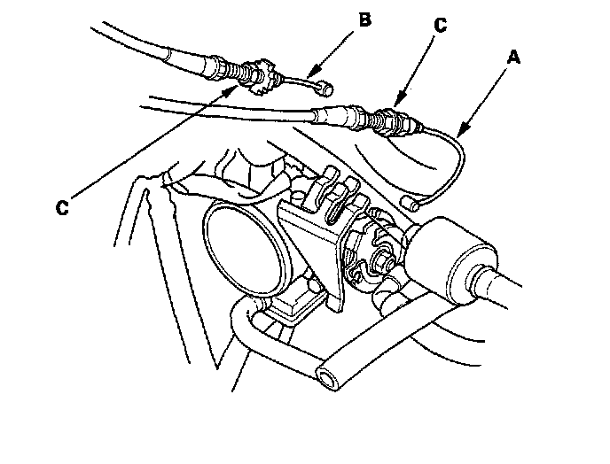 10. Fully open the throttle link and cruise control link by hand, then remove the throttle cable (A) and cruise control cable (B) from the links. Loosen the locknuts (C), and remove the cables from the bracket (K20A2 engine).