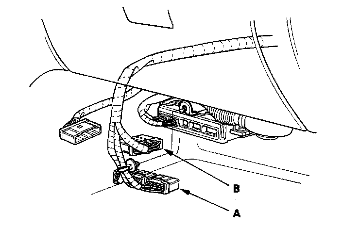 28. Disconnect the Air Fuel Ratio (A/F) Sensor connector (A) and secondary Heated Oxygen Sensor (secondary HO2S) connector (B).