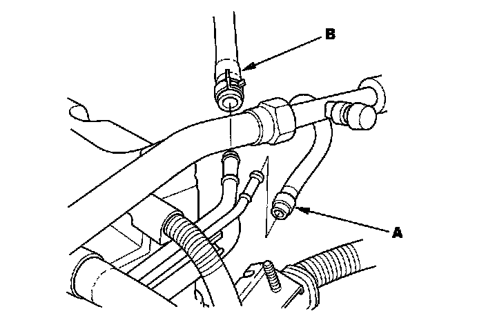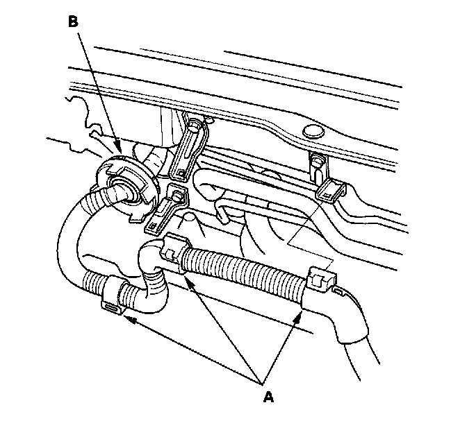 15. Remove the Evaporative Emission (EVAP) canister hose (A) and brake booster vacuum hose (B).