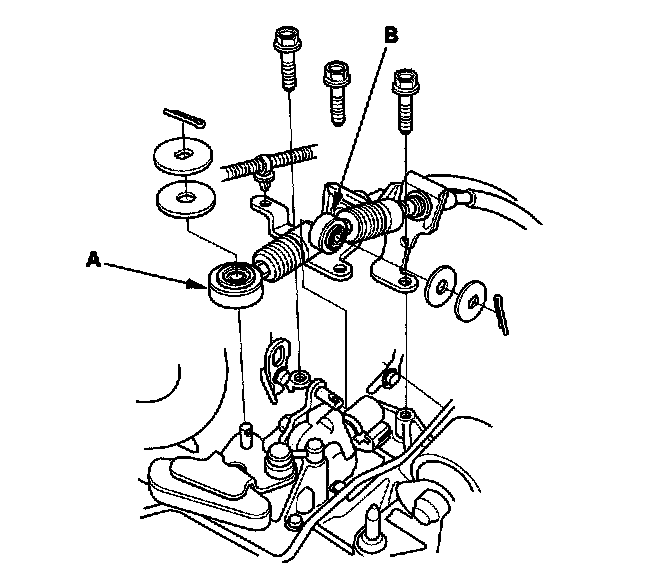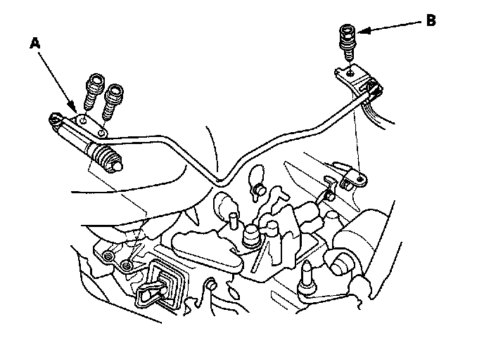 32. Remove the shift cable holder (A), then remove the shift cable cover (B). To prevent damage to the control lever joint, be sure to remove the bolts securing the shift cable cover (A/T).