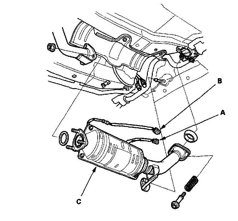 16. Install the Three Way Catalytic Converter (TWC) assembly (A); use new gaskets (B) and new self locking nuts (C).