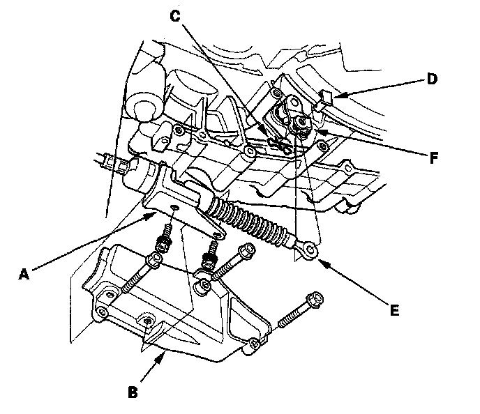 33. Remove the spring clip (C) and control pin (D), then separate the shift cable (E) from the control lever (F) (A/T).