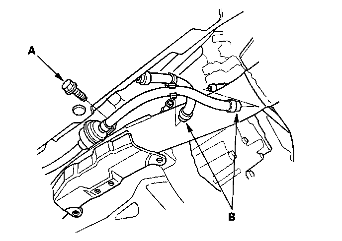 36. Remove the ATF cooler hoses (B), then plug the ATF cooler hoses and lines (A/T)