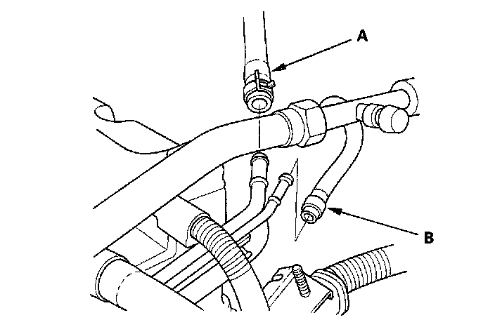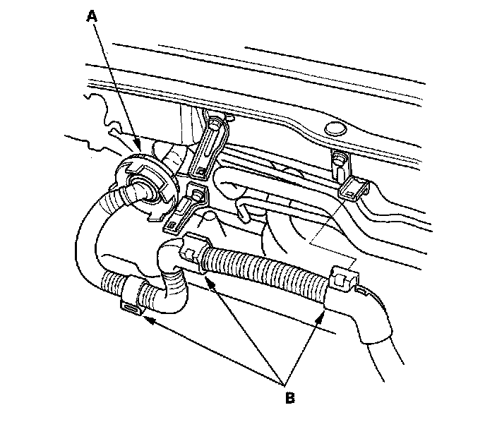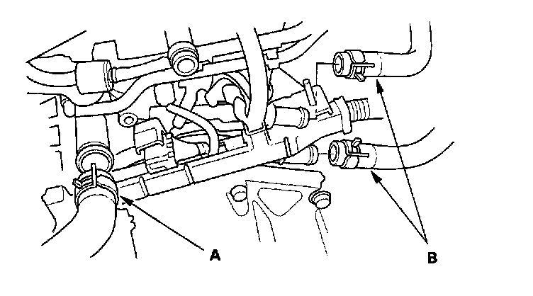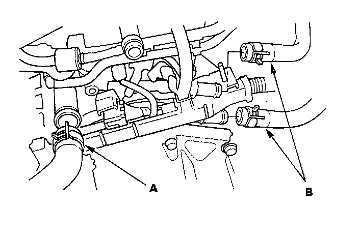 38. Remove the upper hose (A) and heater hoses (B).