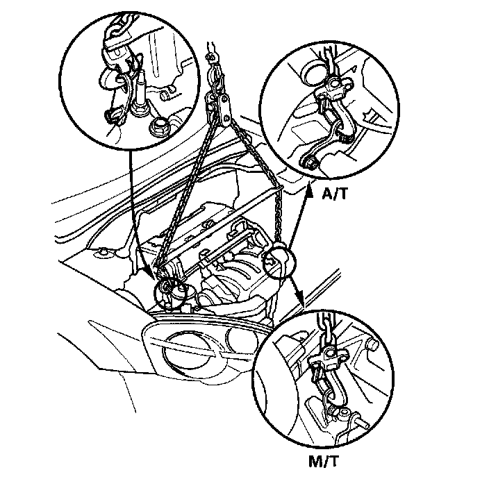 2. Position the engine under the vehicle. Attach the chain hoist to the engine, then lift the engine into position in the vehicle.