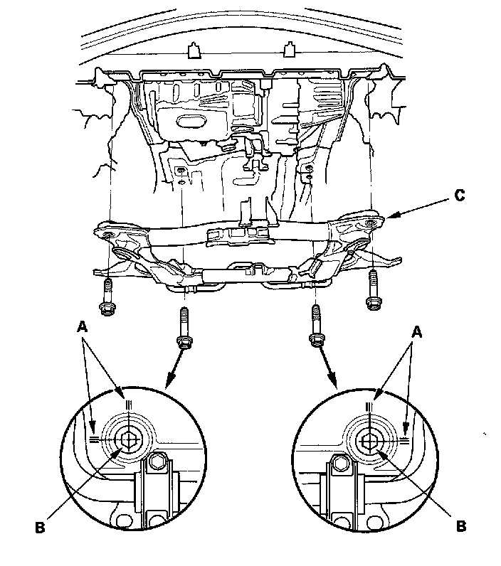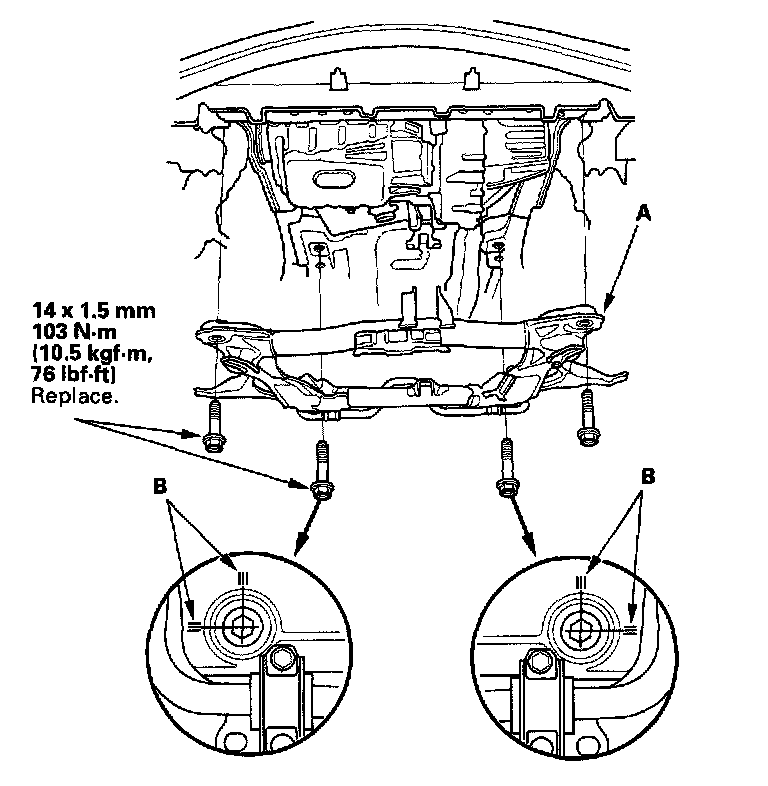 4. Install the sub-frame (A). Align the reference lines (B) on the sub-frame with the bolt head center, then tighten the bolts.