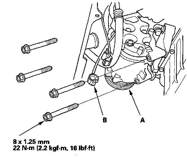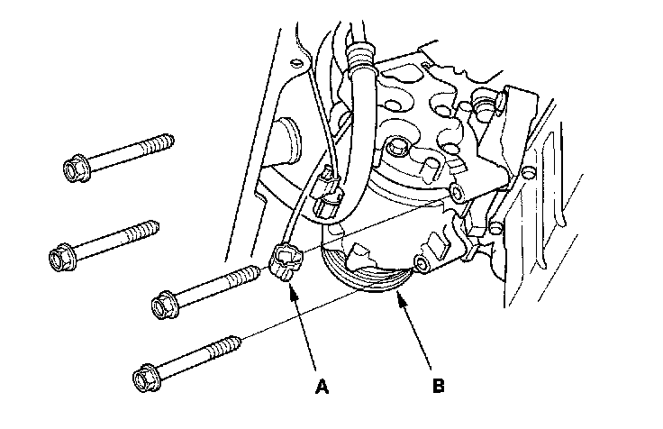 3. Install the A/C compressor (A), and connect the compressor clutch connector (B).
