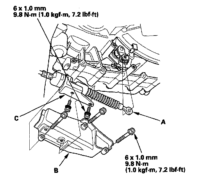 15. Install the shift cable cover (B), then install the shift control cable bracket (C) (A/T).