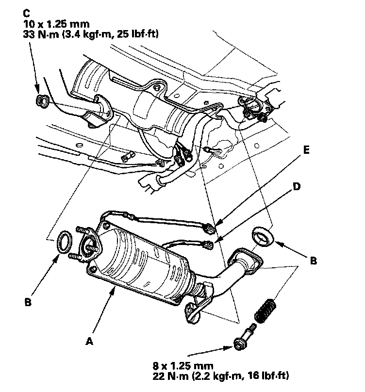 17. Connect the A/F sensor connector (D) and secondary HO2S connector (E).