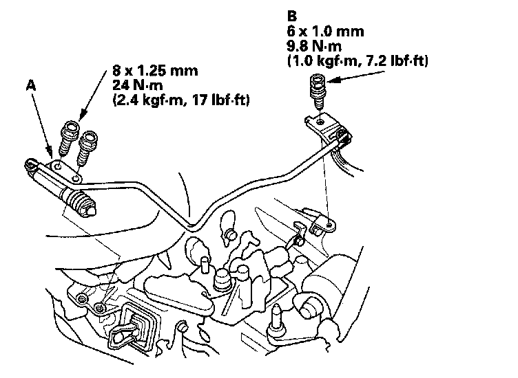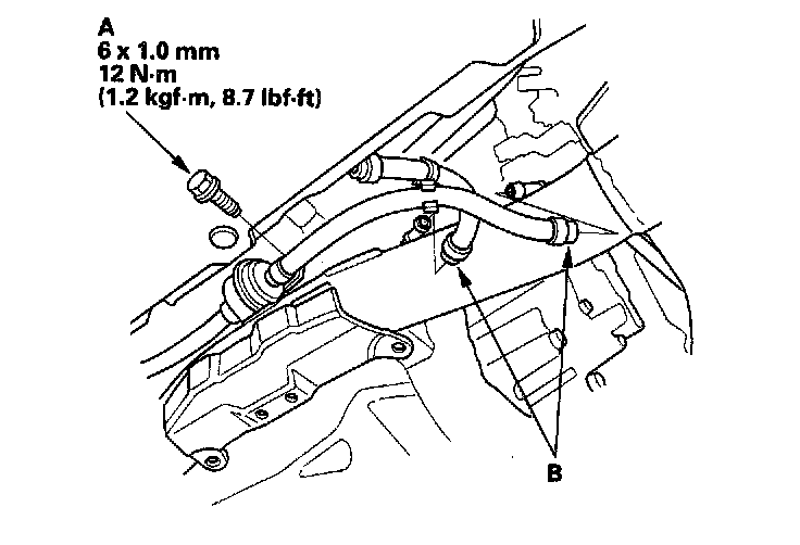 20. Tighten the ATF filter mounting bolt (A), and install the ATF cooler hoses (B) (A/T).