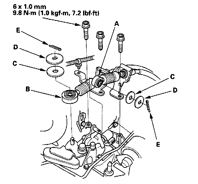 34. Install the select cable (A) and shift cable (B) using the plastic washers (C), washers (D), and new cotter pins (E) (M/T).