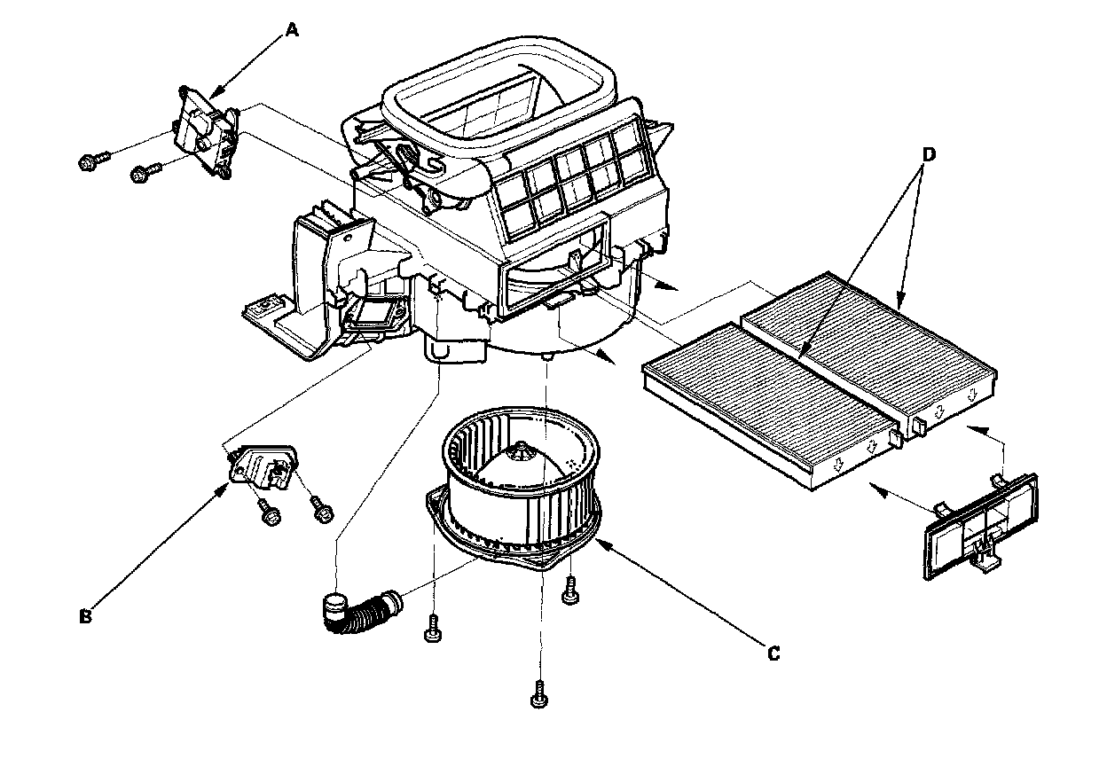 - The recirculation control motor (A), the power transistor (B), the blower motor (C), and the dust and pollen filters (D) can be replaced without removing the blower unit.