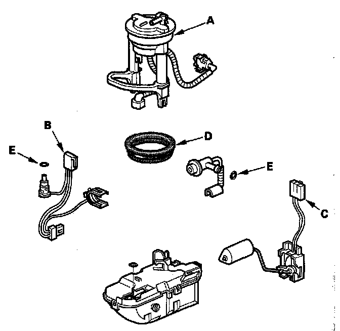 - When installing the fuel gauge sending unit (C), make sure the connection is secure and the connector is firmly locked into place. Be careful not to bend or twist it excessively.