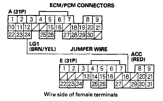2. Momentarily connect ECM/PCM connector terminals A24 and E18 with a jumper wire several times.