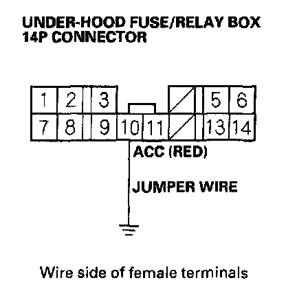 6. Momentarily connect under-hood fuse/relay box 14P connector terminal No.10 and body ground with a jumper wire several times.