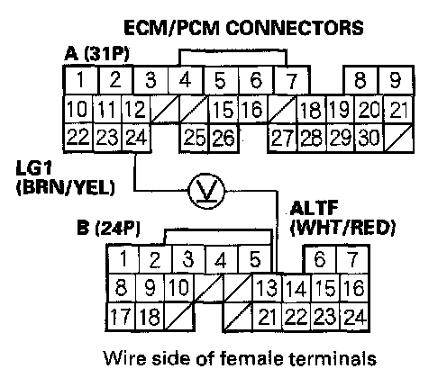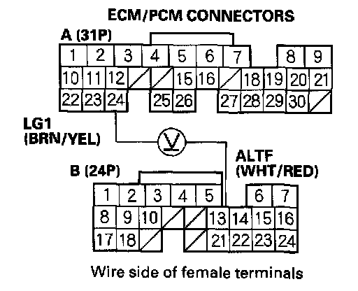 3. Measure voltage between ECM/PCM connector terminals A24 and B13.