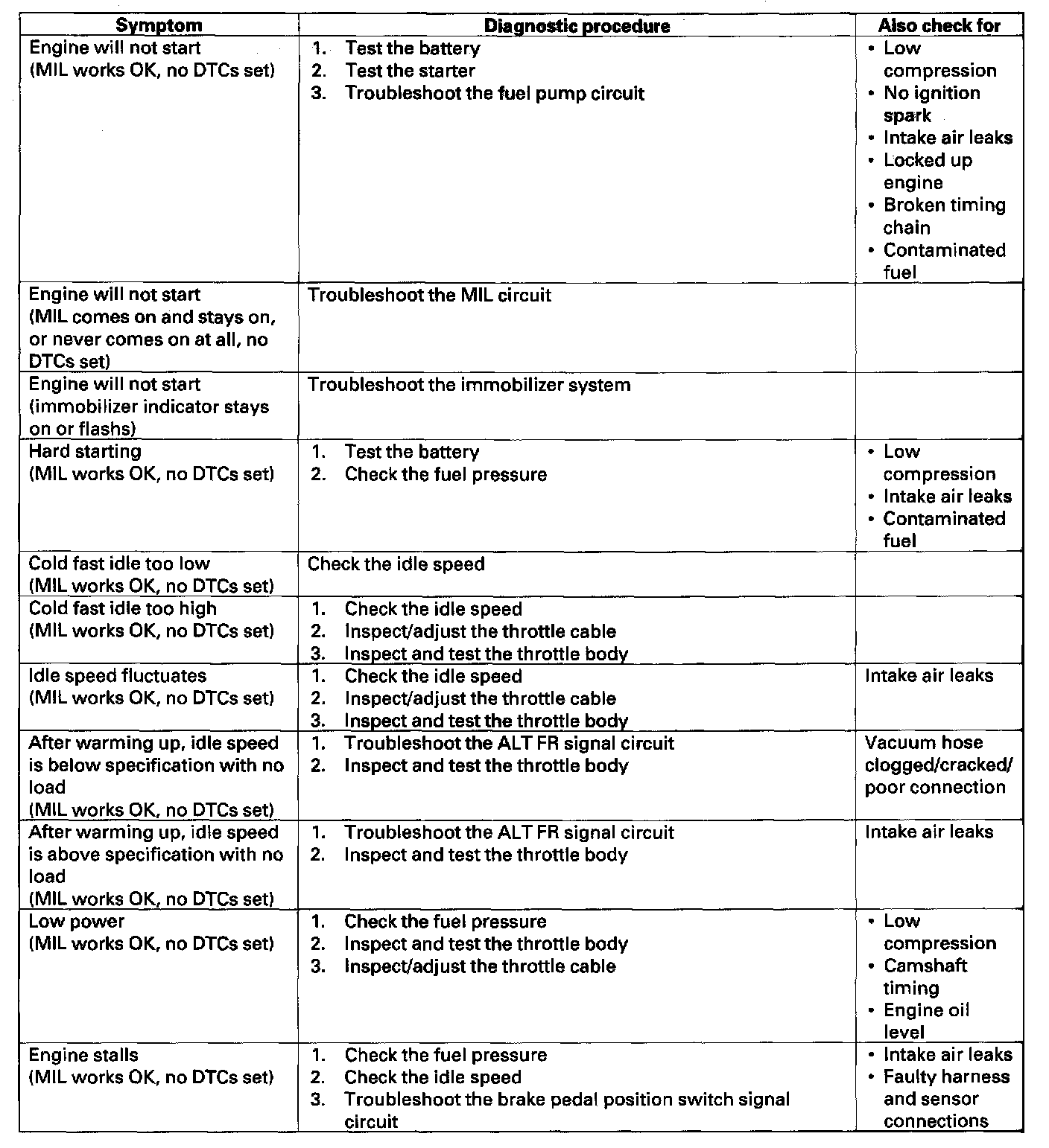 When the vehicle has one of these symptoms, check for a diagnostic trouble code (DTC) with the scan tool. If there is no DTC, do the diagnostic procedure for the symptom, in the sequence listed, until you find the cause.