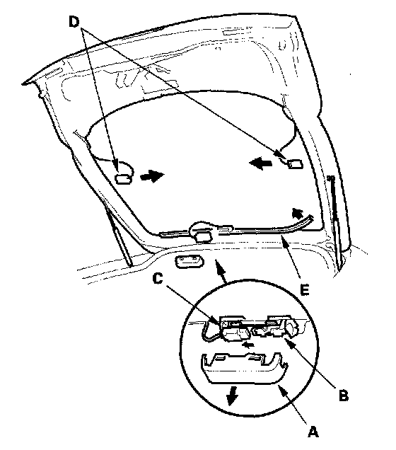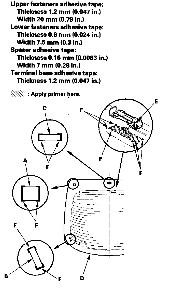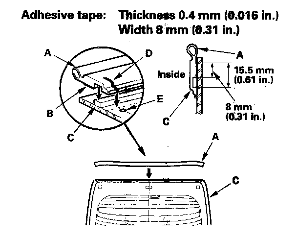 11. Attach the upper fasteners (A), the lower fasteners (B), and the spacer (C) with adhesive tape to the inside face of the rear window (D) as shown. If necessary, apply primer to the areas where the window antenna terminal base (E) will be attached, then attach the base with adhesive tape: