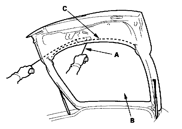 6. With a helper on the outside, pull the piano wire (A) back and forth in a sawing motion. Hold the piano wire as close to the rear window (B) as possible to prevent damage to the hatch, and carefully cut through the adhesive (C) around the entire rear window.