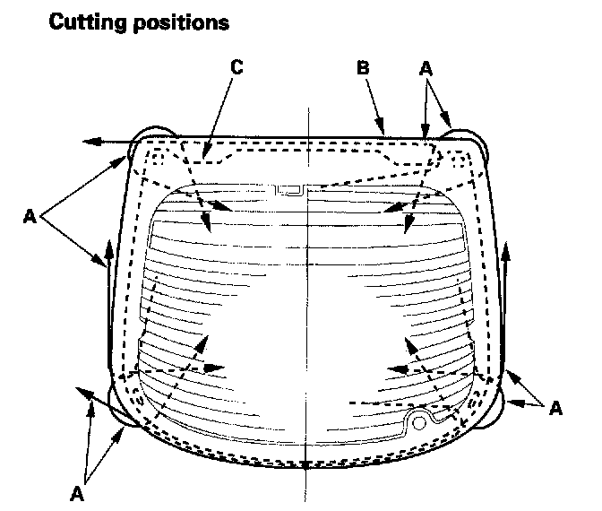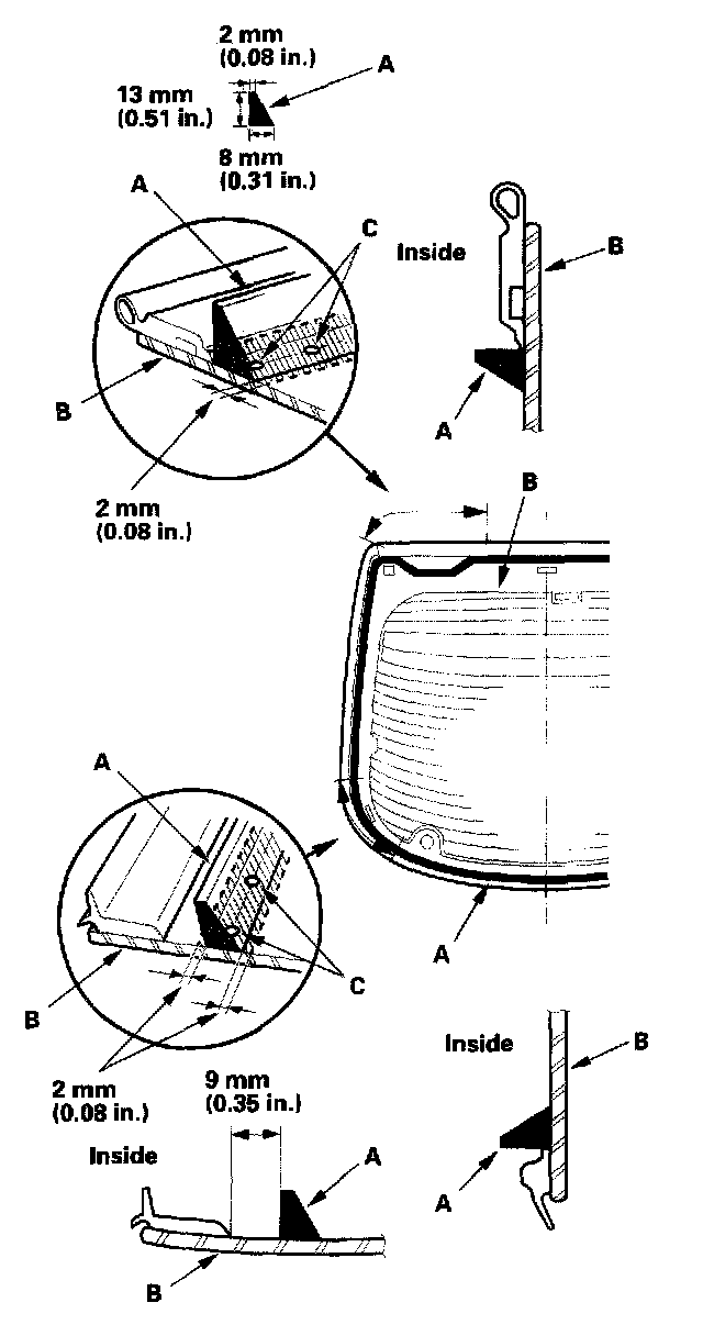 21. Put the cartridge in a caulking gun, and run a bead of adhesive (A) around the edge of the rear window (B) as shown. With the printed dots (C) on the rear window as a guide, apply the adhesive to both side portions of the rear window. Apply the adhesive within 30 minutes after applying the glass primer. Make a slightly thicker bead at each corner.