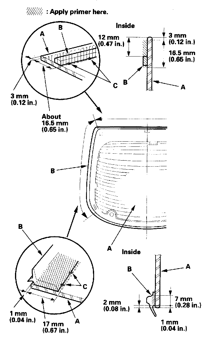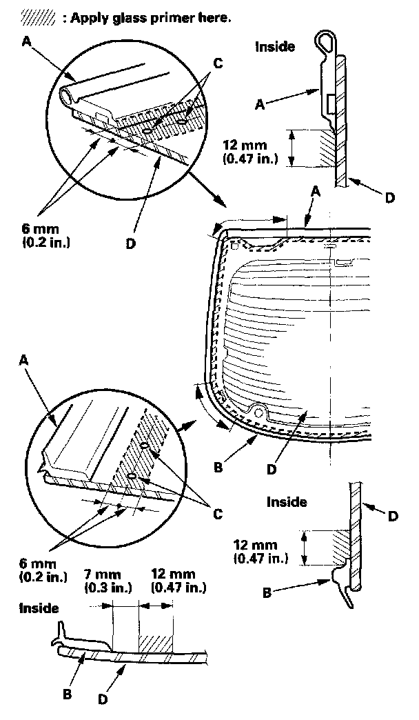 18. With a sponge, apply a light coat of glass primer along the edge of the upper molding (A) and rear window molding (B) as shown, then lightly wipe it off with gauze or cheesecloth: