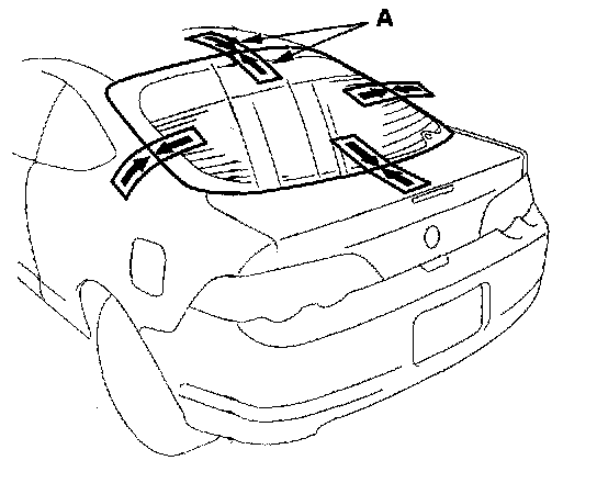 16. Set the rear window in the opening, and center it. Make alignment marks (A) across the rear window, hatch, and body with a grease pencil at the four points shown. Be careful not to touch the rear window where adhesive will be applied.