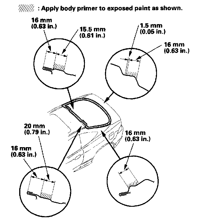 - Never touch the primed surfaces with your hands. If you do, the adhesive may not bond to the rear window properly, causing a leak after the rear window is installed.
