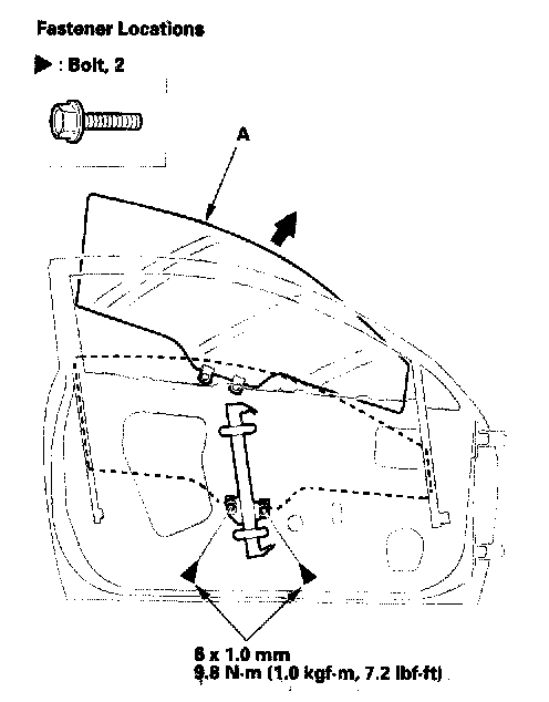 2. Carefully raise the glass (A) until you-can see the bolts, then remove them. Carefully pull the glass out through the window slot. Take care not to drop the glass inside the door.