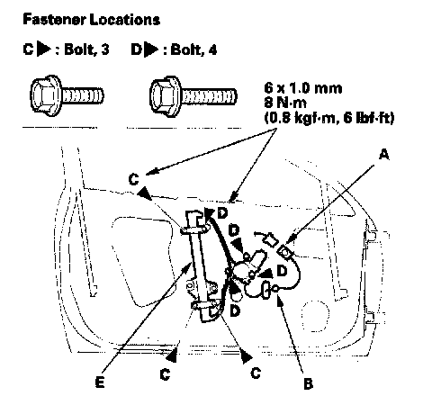 4. Remove the bolts (C), and loosen the bolts (D), then remove the regulator (E) through the hole in the door.