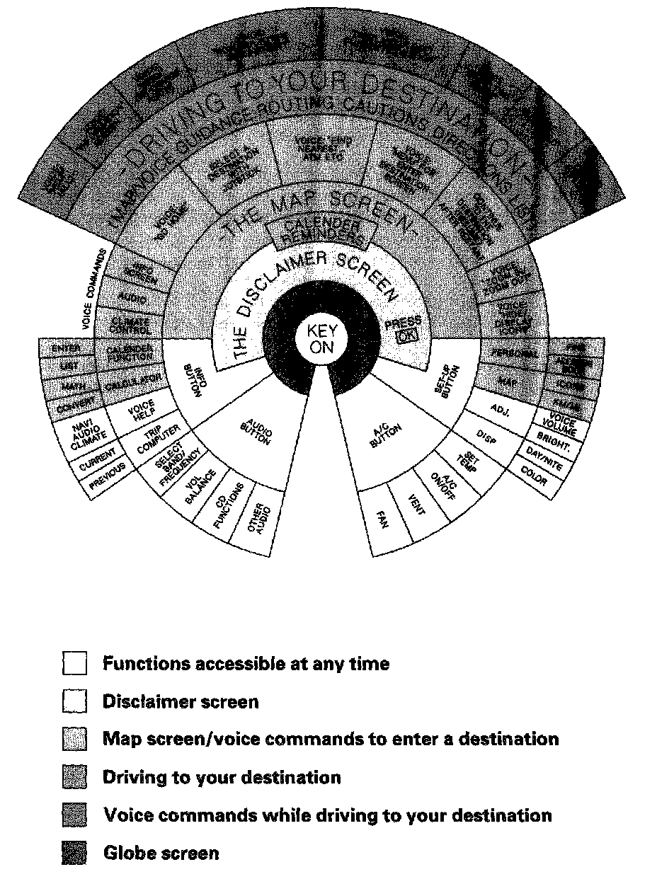 This diagram shows the features of the navigation system starting at the center and working outward in layers. The navigation program starts at "Key ON", and then displays the globe screen. Once the disclaimer screen is acknowledged, the next shaded portions of the diagram become active. However, some functions of the INFO and SET UP buttons, and all functions of the AUDIO and A/C buttons can be accessed immediately after the globe screen (white).