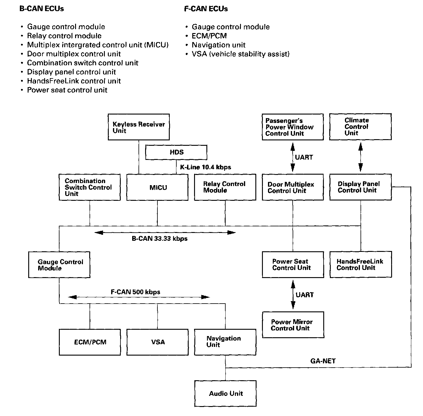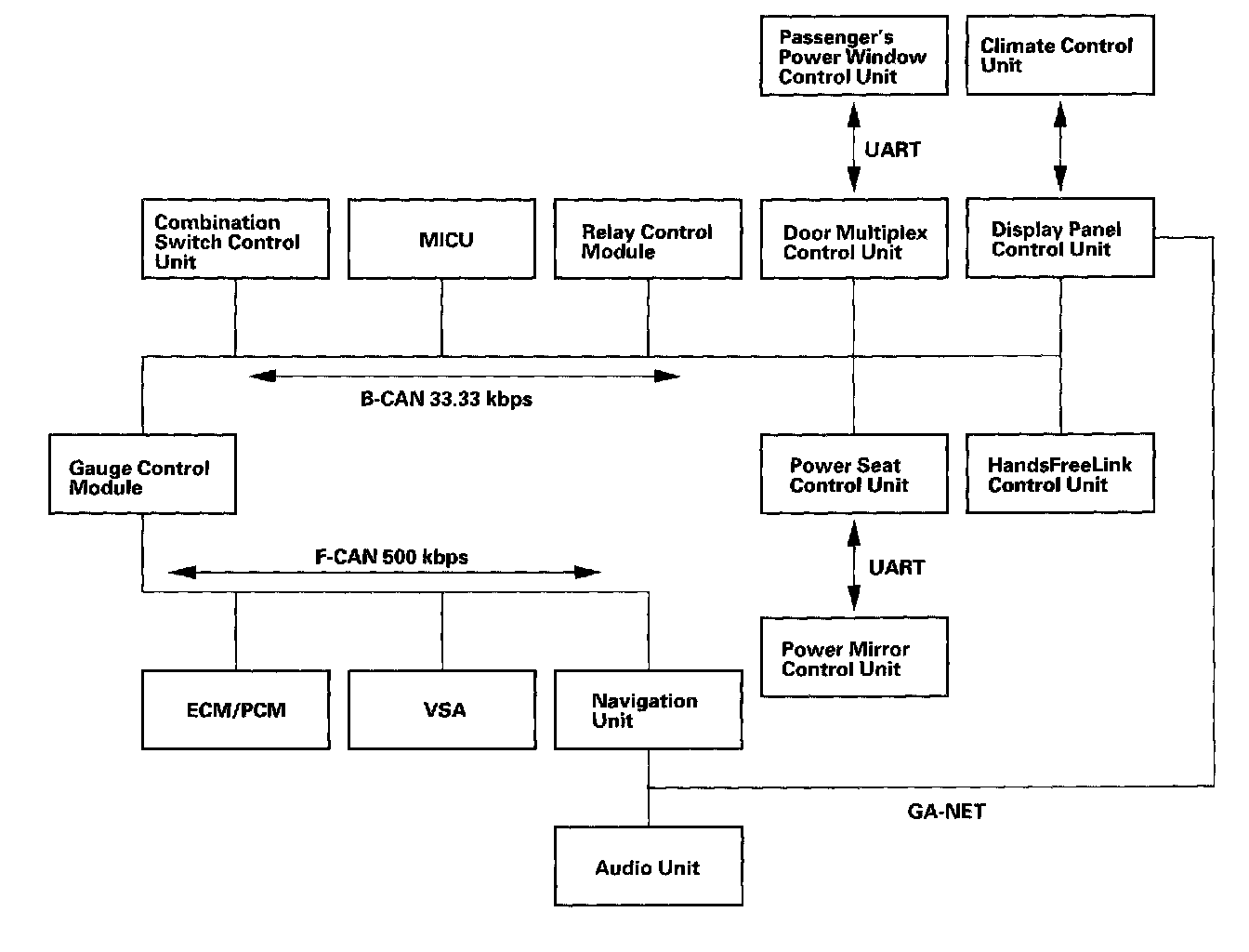 The fast controller area network (F-CAN) and the body controller area network (B-CAN) share information between multiple electronic control units (ECUs). B-CAN communication moves at a slower speed for convenience related items and for other functions. F-CAN information moves at a faster speed for "real time" functions such as fuel and emissions data. To allow both systems to share information, the gauge control module translates information from the B-CAN to the F-CAN and from the F-CAN to the B-CAN.