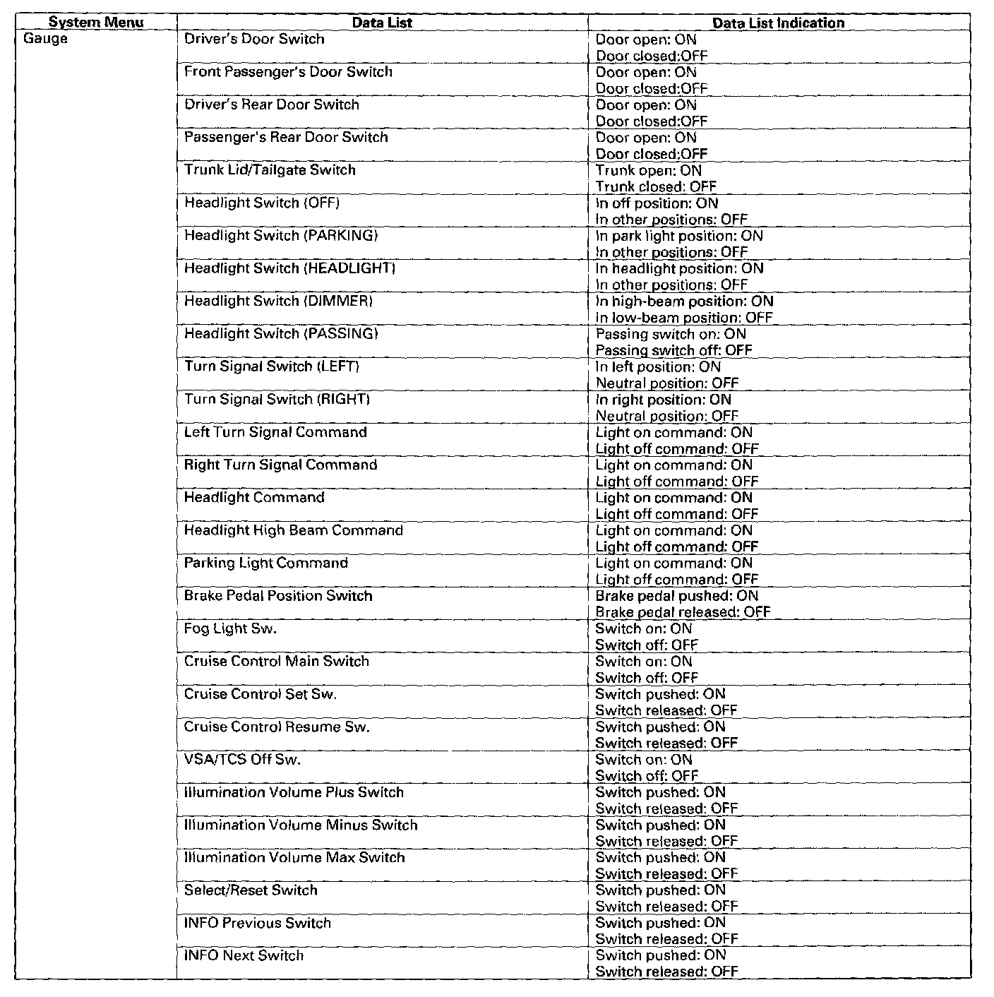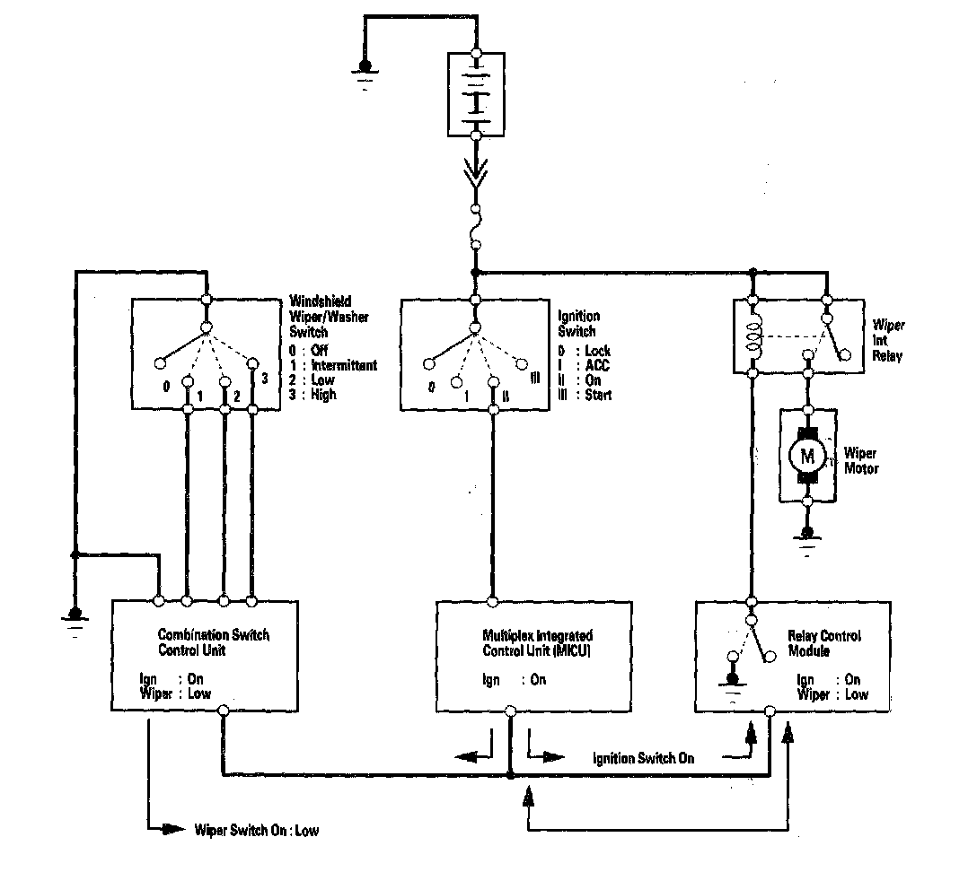 3. The multiplex integrated control unit (MICU), relay control module, and gauge control module expect to receive the door lock switch signal, but since there is a break in the communication circuits, it is not received.